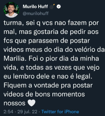 As lembranças de um dos dias mais tristes da história da música brasileira fez Murilo Huff fazer um pedido especial aos fãs nesta quinta-feira (28/7). Ao ver trechos de vídeos do velório de Marília Mendonça em que aparece sendo compartilhados por fã clubes, o cantor pediu que o momento fosse esquecido.