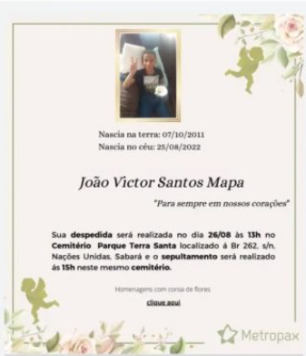 João Victor será sepultado em Sabará, região metropolitana de BH. O velório está marcado para 13h e o enterro, 15h.
