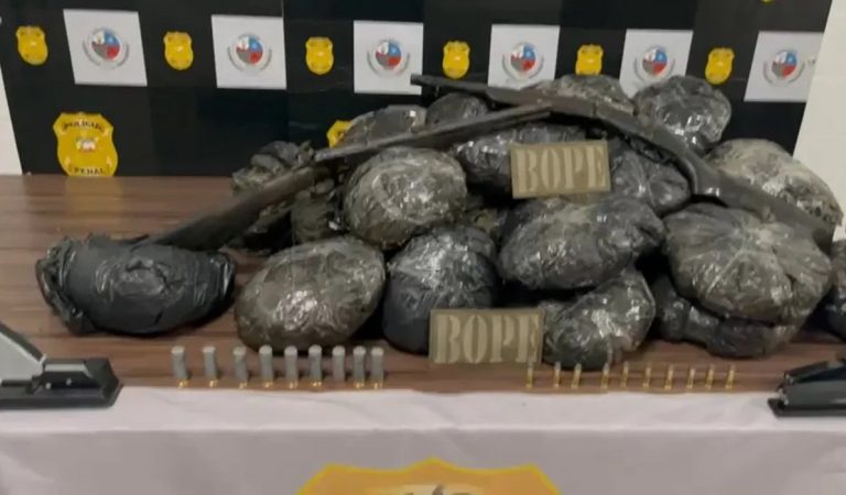 Dois homens foram presos com cerca de 30 kg de maconha natural, uma arma calibre 12, um rifle calibre 44 e munições dentro de um carro estacionado no shopping da parte alta da capital. As prisões e apreensões resultaram de uma operação realizada pela Polícia Penal e Polícia Militar na manhã desta segunda-feira (5).