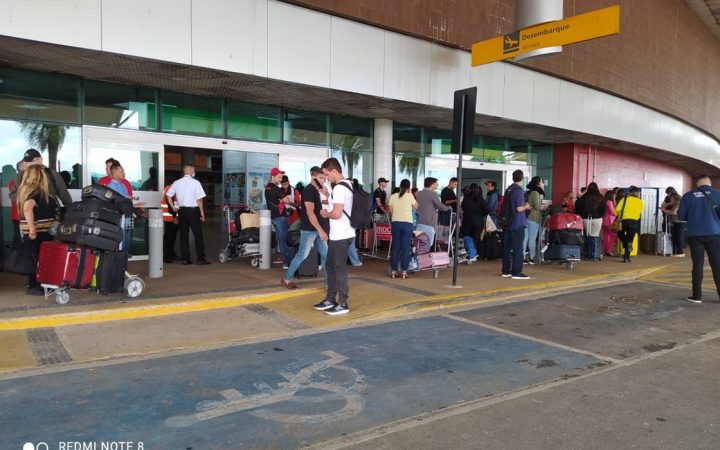 Aglomerados no exterior, passageiros que iriam embarcar e acompanhantes aguardam informações ou uma possível liberação do local. O Esquadrão Antibombas do BOPE/AL atua na ocorrência.