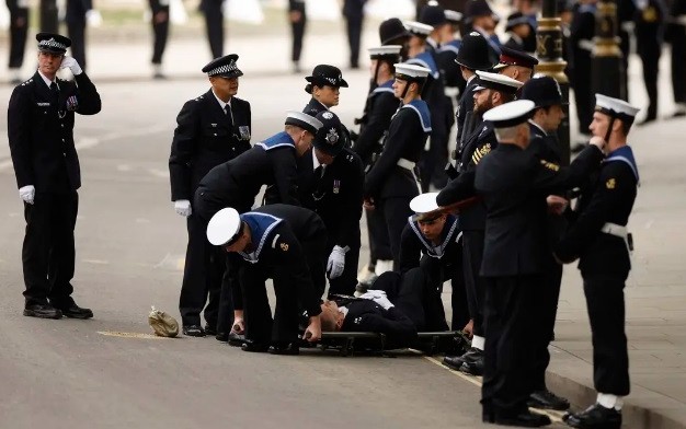 Um policial que não teve o nome identificado desmaiou nas ruas de Londres durante parte da cerimônia que levava o caixão da rainha Elizabeth II para a Abadia de Westminster.
