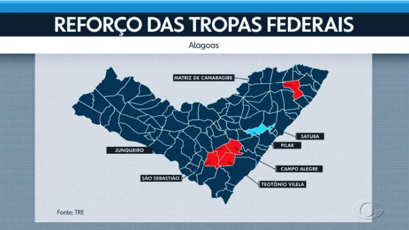 O Tribunal Superior Eleitoral (TSE) negou o pedido de envio de tropas federais para cinco cidades de Alagoas durante as eleições de domingo (2). Em sua decisão, o ministro Alexandre de Moraes explica que o Governo do Estado garantiu que consegue manter a segurança do pleito nos municípios de São Sebastião, Campo Alegre, Junqueiro, Teotônio Vilela e Matriz de Camaragibe, sem a necessidade do auxílio federal.
