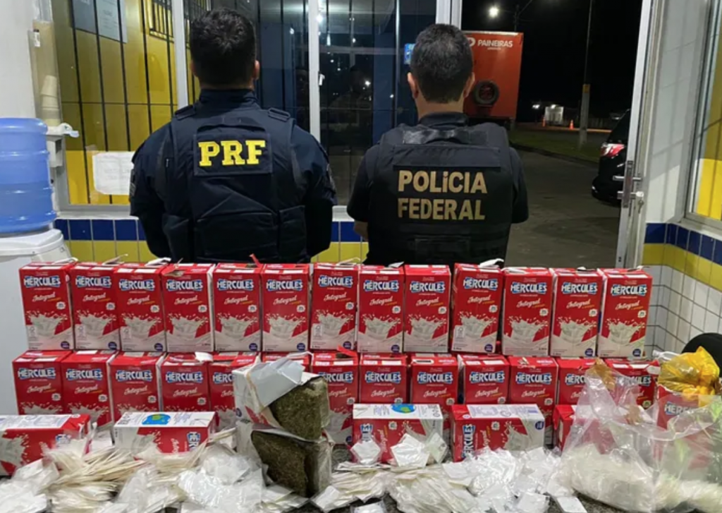Ao fiscalizar o bagageiro, foram encontradas aproximadamente 28kg de substância análoga a maconha, em caixas de leite, e 500 g de Cocaína.