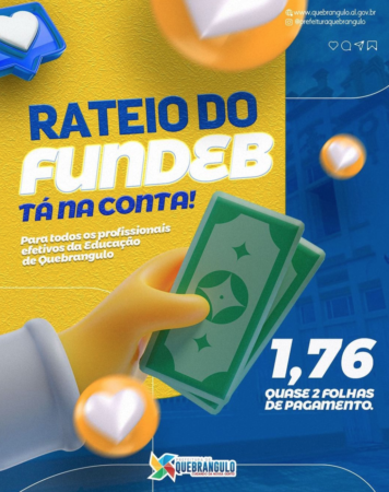 Prefeitura de Quebrangulo, por meio da Secretaria Municipal de Educação, orgulhosamente anuncia o pagamento do Rateio 2022 dos Servidores dos 70% do Fundeb efetivos, honrando àqueles que tem feito da nossa educação, uma das melhores de nossa região.