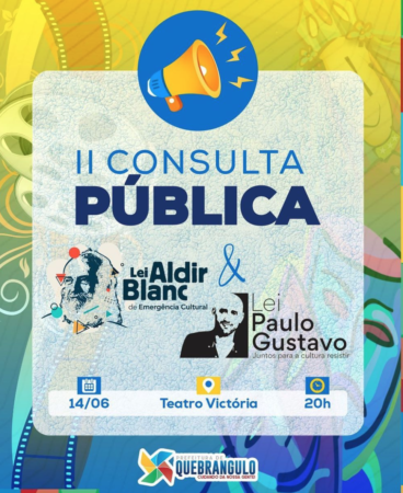 A Prefeitura de Quebrangulo, por meio do Departamento Municipal de Cultura, promove II Consulta Pública para a sociedade civil apresente sugestões para a implantação da Lei Paulo Gustavo e Aldir Blanc no município e é voltada para artistas, produtores, prestadores de serviços culturais e interessados em geral sobre Políticas Públicas de Cultura.