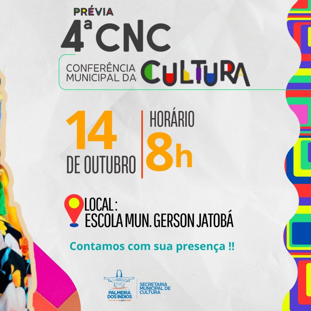 No próximo sábado, 14 de outubro, acontecerá a Prévia da 4ª Conferência Municipal em Palmeira dos Índios, que reunirá os agentes culturais da região em torno do tema central “Democracia e Direito à Cultura.”