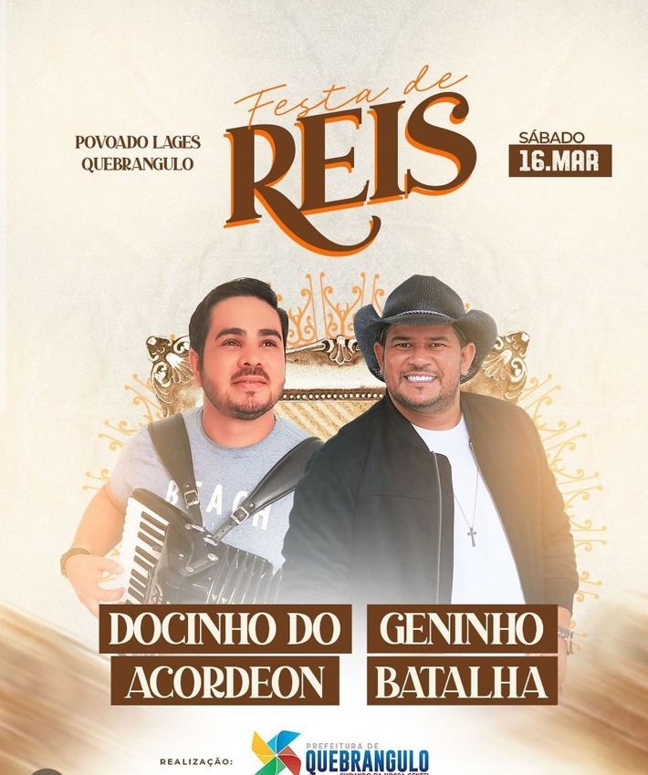 O Prefeito de Quebrangulo, Marcelo Lima, anunciou a programação da tradicional festa de Reis do povoado Lages, que contará com Docinho do Acordeon e Geninho Batalha, no dia 16 de março.