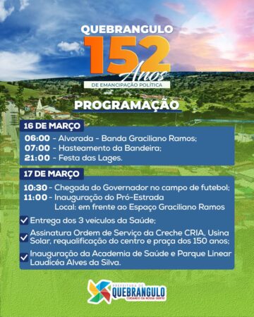 O município de Quebrangulo comemora 152 anos de emancipação política neste sábado (16), com muita alegria e desenvolvimento.