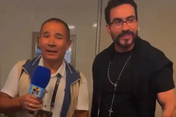 Inicialmente, o padre passa pelo jornalista e se dirige a uma mesa com alimentos. Quando percebe a aproximação do profissional, Melo declara que não está em condições de conversar devido à sua voz comprometida, alegando que precisa preservar sua voz para cantar durante o evento. Apesar disso, o repórter assegura que respeitará o momento e promete uma entrevista breve.