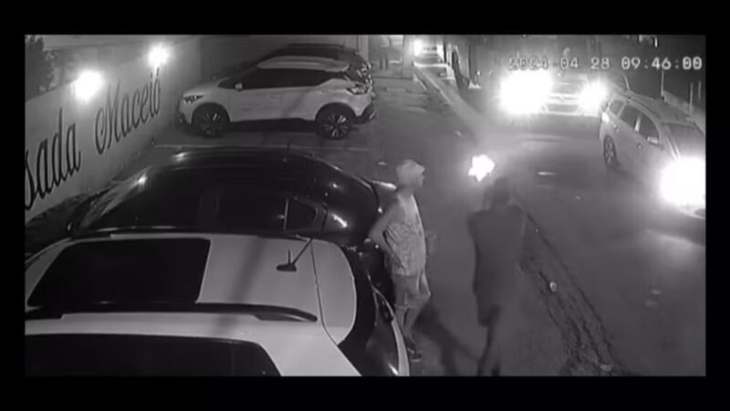 Um policial militar de Pernambuco, que estava de folga passando o fim de semana em Maceió, foi preso em flagrante na noite de sábado (27) depois de atirar contra um homem que passava na rua. Uma câmara de segurança registrou toda a ação.