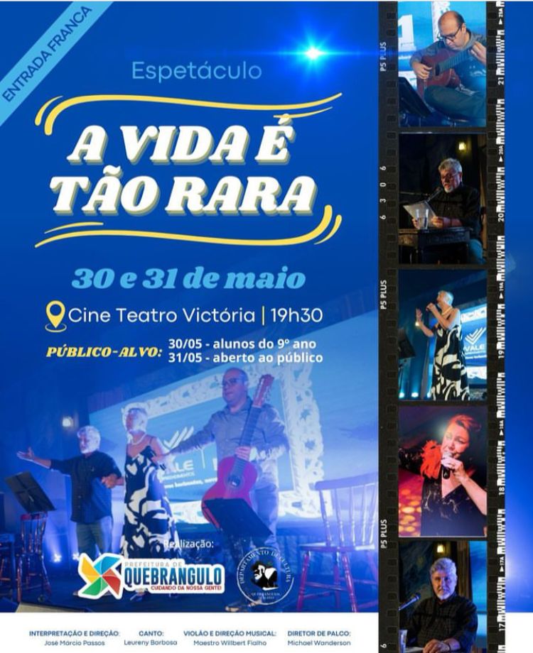 O Departamento Municipal de Cultura da cidade de Quebrangulo convida a todos para prestigiar o espetáculo “A VIDA É TÃO RARA” que acontecerá nos dias 30 e 31 de maio no Cine Teatro Municipal, às 19h.