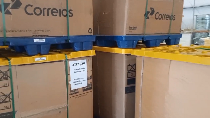 De acordo com os Correios, até esta quarta-feira, cerca de 11 mil toneladas de doações haviam sido recebidas. Desse total, cerca de 3 mil toneladas já foram entregues à Defesa Civil, em Porto Alegre. A empresa realiza gestão logística do restante da carga, liberada conforme orientação da Defesa Civil.