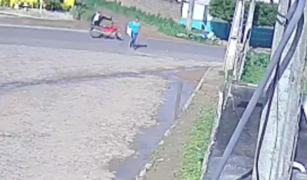 Uma mulher aparece atravessando a pista às pressas e, para evitar o atropelamento, o homem desvia a moto, mas acaba derrapando.