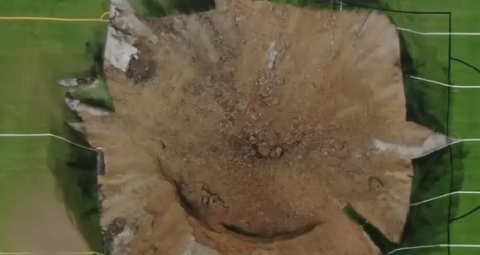 Cratera gigante se abre no meio de campo de futebol