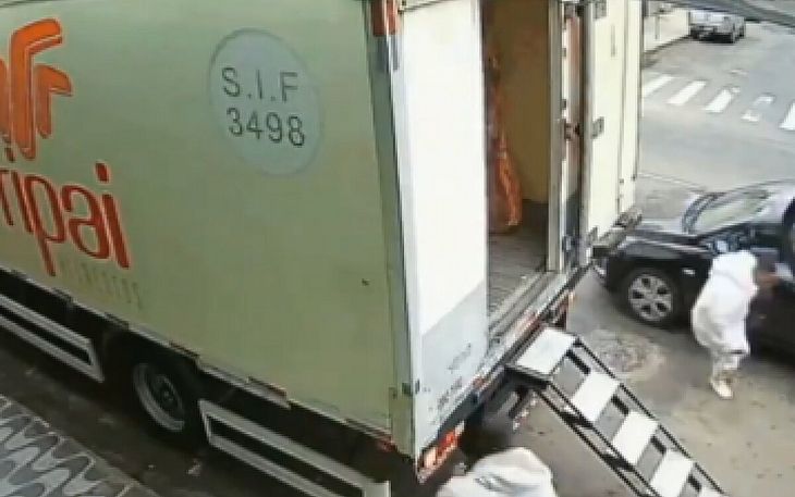 Em seguida, o funcionário desce do baú do frigorífico e vai até a cabine do caminhão, onde pega um objeto. Nesse instante, o policial seguiu com o seu veículo por trás do caminhão, porém não foi possível ver o que aconteceu. Na sequência, o mesmo funcionário e outro companheiro de trabalho aparecem correndo. Já o policial surge novamente, com a mão na cintura.