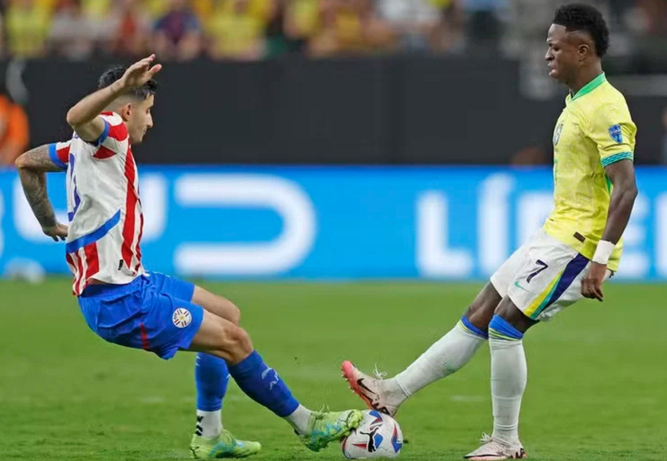 A Seleção Brasileira seguiu com mesmo problema da estreia da Copa América até a metade do primeiro tempo: muita posse de bola, mas com pouca agressividade e eficência para chegar ao ataque. Até que aos 30 minutos, o árbitro marcou pênalti para o Brasil após chute pegar no braço de Cubas. Paquetá bateu e errou feio. Seria o cenário ideal para uma tragédia, mas pelo contrário. A equipe, aliás, não se abateu e, logo em seguida, recebeu na área e tocou na saída do goleiro. Depois dos 40, Savinho aproveitou o erro da defesa paraguia para ampliar a vantagem. E, no último lance da primeira etapa, Vini Jr, melhor em campo, fez o gol quase na pequena área depois de Alderete afastar mal a bola.