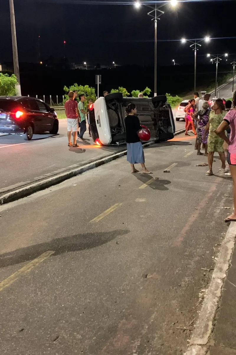 Um carro com quatro ocupantes capotou, na noite dessa quinta-feira (4), na Avenida Josefa de Melo, em Cruz das Almas, Maceió.