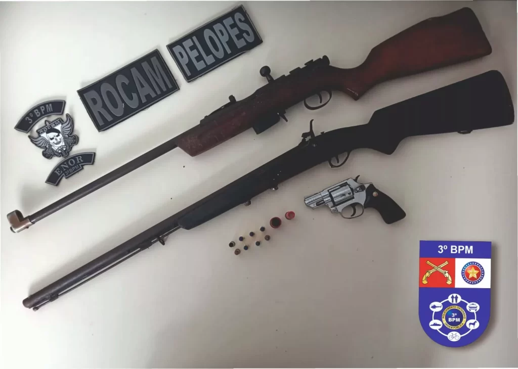 A guarnição Pelopes foi até o endereço, apreendeu o revólver e mais duas armas, uma espingarda Cal. 38 e uma artesanal. Um outro funcionário acabou detido em flagrante, já que o patrão, que seria dono dos instrumentos, não estava no local.