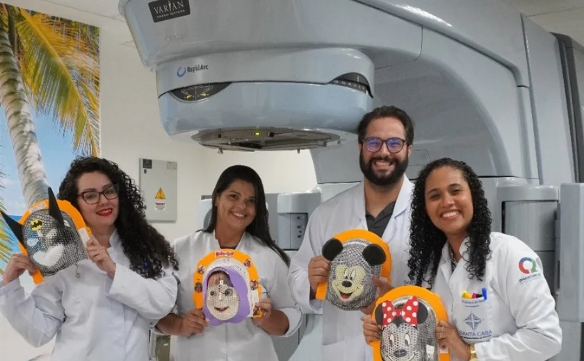 Crianças com câncer que fazem tratamento no acelerador nuclear da Santa Casa de Maceió contam com máscaras customizadas para deixar o momento menos difícil. O acessório é utilizado durante as sessões de radioterapia, que duram entre 12 e 15 minutos.Dessa forma, Mickey, Minnie, Batmam, Masha, entre outros personagens de desenhos e filmes, fazem companhia aos pequenos pacientes, em uma iniciativa lúdica e extrovertida da equipe multidisciplinar da Radioterapia do hospital, formada por médicos, rádio-oncologistas, técnicos de radiologia, enfermagem, físicos e recepção.