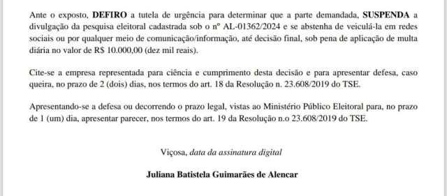 Na pesquisa foram encontrados indícios de irregularidades em vários aspectos. Ficou então determinado que em caráter de urgência “suspenda a divulgação da pesquisa eleitoral cadastrada sob número AL – 01362/2024 e se abstenha de veiculá-la em redes sociais ou por qualquer meio de comunicação/informação, até decisão final, sob pena de aplicação de multa diária no valor de R$ 10.000,00 (dez mil reais)”.