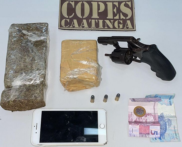 Uma guarnição da Companhia Independente de Operações Policiais Especiais do Sertão (Copes) deteve na noite dessa segunda-feira (16), no município de Piranhas, um homem de 25 anos de idade. Com ele, os militares apreenderam um revólver calibre 32, uma sacola com 732 gramas de maconha, um aparelho celular, três munições intactas e R$ 8,00 em espécie.
