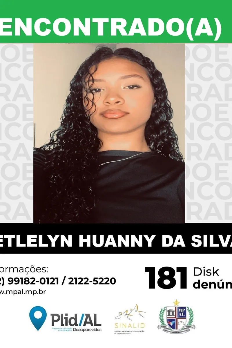 A adolescente Ketlelyn Huanny da Silva, de 14 anos, que desapareceu na segunda-feira (21) ao sair de casa, na Levada, em Maceió, foi encontrada. A informação foi repassada pelo pai da menor, Sandro Silva.