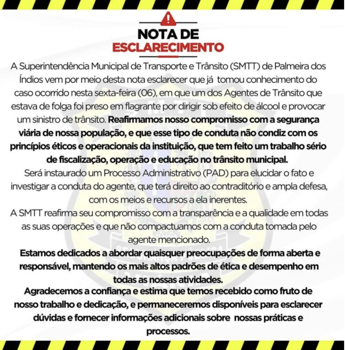 A SMTT de Palmeira informou que a conduta do agente “não condiz com os princípios éticos e operacionais da instituição”, conforme nota abaixo: