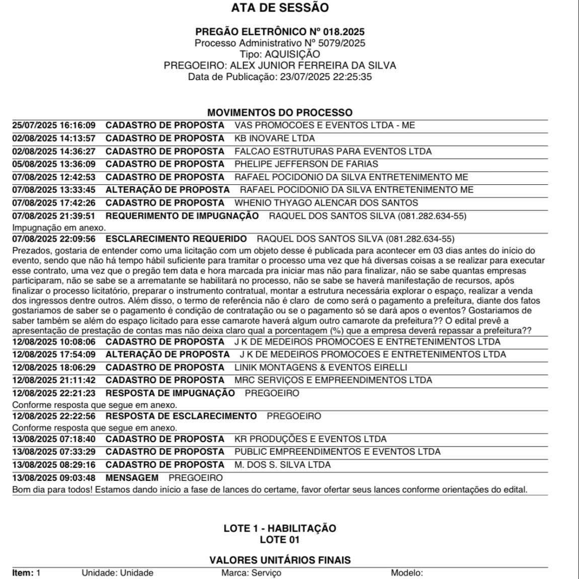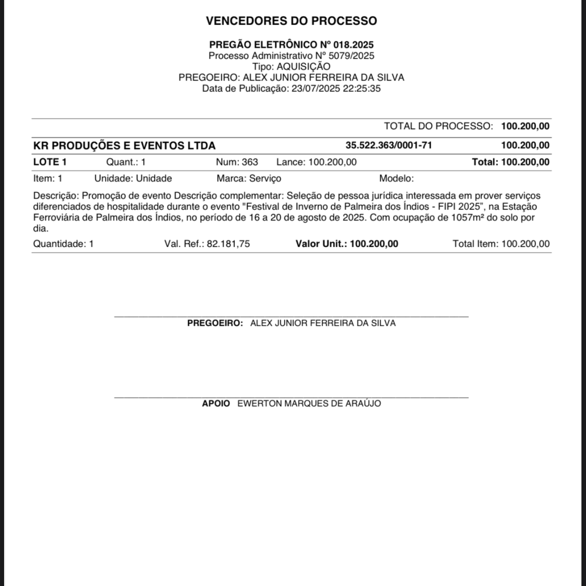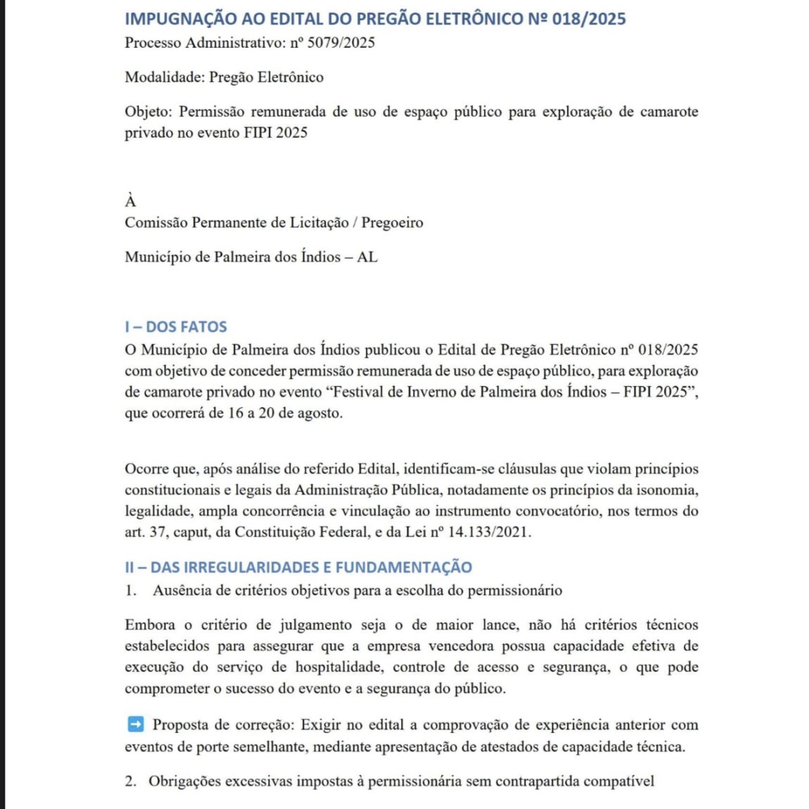 O camarote privado do Festival de Inverno de Palmeira dos Índios (FIPI 2025) não acontecerá, mesmo após a empresa KR Entretenimento, de Goiana (PE), ter vencido o pregão eletrônico nº 018/2025 com proposta de R$ 100.200,00. O pregão, publicado às pressas poucos dias antes do evento, foi impugnado pela própria prefeitura, levando a empresa a desistir do negócio.