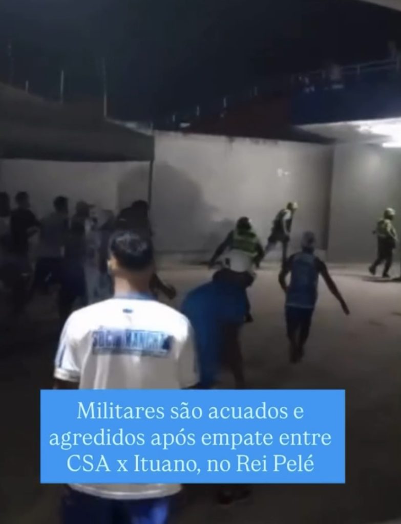 Um vídeo que circula nas redes sociais mostra equipes da Polícia Militar sendo acuadas e agredidas por torcedores do CSA no Estádio Rei Pelé, em Maceió, na noite deste sábado (16). O episódio ocorreu logo após o empate por 2 a 2 contra o Ituano, pela Série C do Campeonato Brasileiro.
