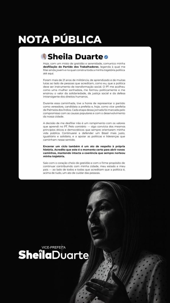 A vice-prefeita de Palmeira dos Índios, Sheila Duarte, anunciou sua saída do Partido dos Trabalhadores (PT) após mais de duas décadas de militância. A decisão, embora envolta em palavras de gratidão e serenidade, reflete o esvaziamento político da dirigente depois que o ex-deputado federal Paulão perdeu o comando do diretório estadual da legenda para o deputado Ronaldo Medeiros.