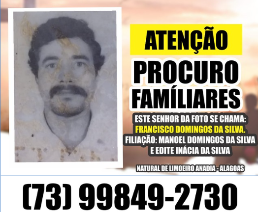 O senhor Flávio, residente em Nova Viçosa, no sul da Bahia, está em busca de informações que possam ajudá-lo a reencontrar os familiares de seu pai, identificado como Francisco Domingos da Silva, natural do município de Limoeiro de Anadia, no interior de Alagoas.