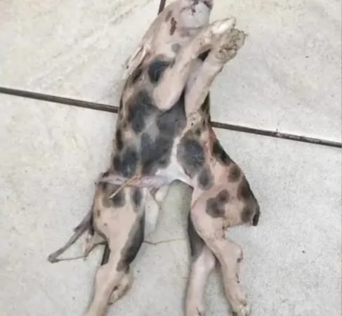 O animal fazia parte de uma ninhada de sete filhotes, mas nasceu já sem vida. A cena despertou curiosidade entre familiares e vizinhos, que nunca haviam presenciado algo semelhante.