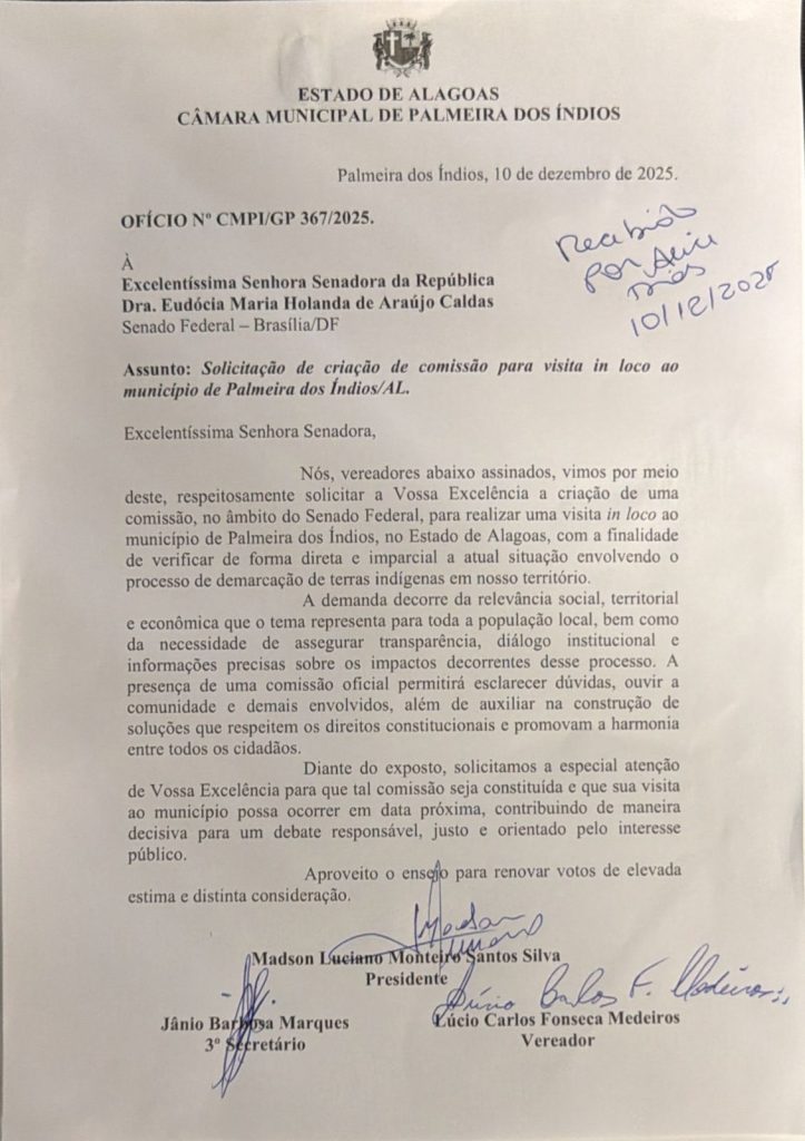 O ofício foi assinado por Madson Monteiro, pelo vereador Jânio Barbosa Marques (3º secretário) e pelo vereador Lúcio Carlos Fonseca Medeiros, que compõem a comitiva responsável pelo pedido. O documento destaca que a presença de uma comissão oficial do Senado é fundamental para assegurar transparência, diálogo institucional e acesso a informações técnicas sobre os impactos sociais e econômicos da demarcação.