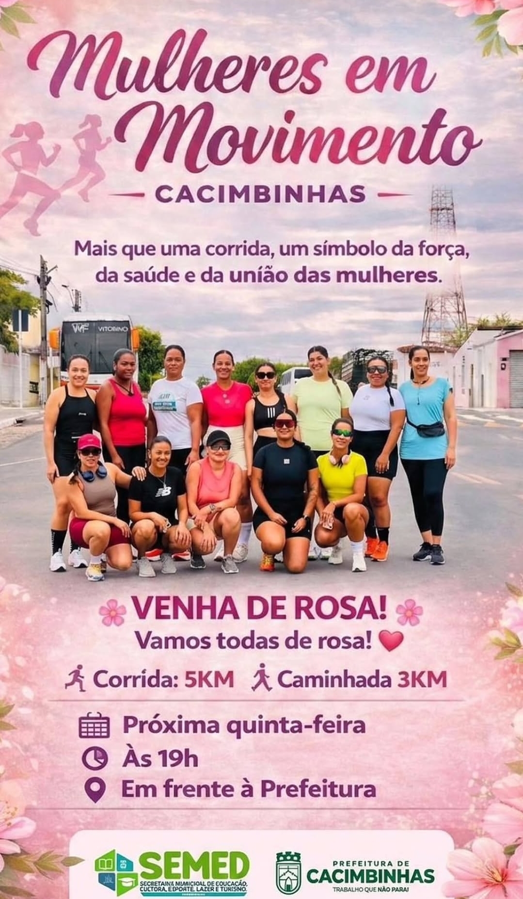 A ação tem como objetivo incentivar a prática de atividades físicas e fortalecer a união entre as mulheres do município, promovendo bem-estar, qualidade de vida e integração social. A organização também convida todas as participantes a vestirem roupas na cor rosa, símbolo da força e da representatividade feminina.