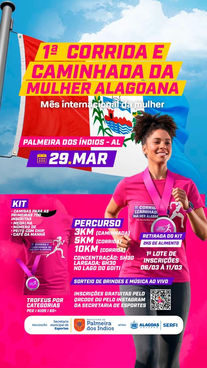 A cidade de Palmeira dos Índios se prepara para receber um evento especial voltado à valorização da saúde, do esporte e do protagonismo feminino. No dia 29 de março será realizada a 1ª Corrida e Caminhada da Mulher Alagoana, reunindo participantes em uma grande celebração ao Mês Internacional da Mulher.