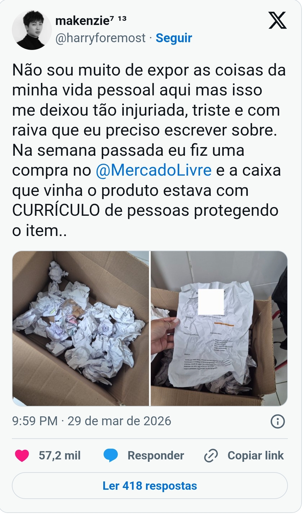 De acordo com o relato, ao abrir a caixa, o cliente encontrou dezenas de currículos amassados sendo utilizados como material de proteção do item. Ao todo, foram identificados 32 documentos contendo informações sensíveis, como nomes completos, endereços, telefones e números de identificação.
