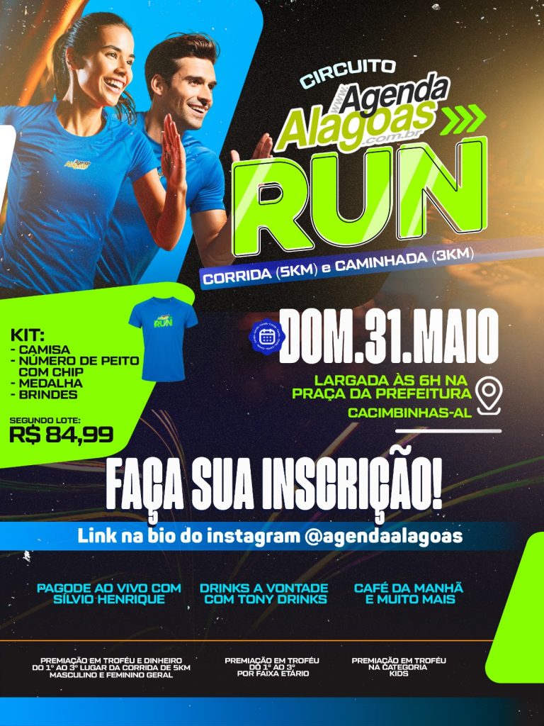 Os amantes de atividade física já têm compromisso marcado no Agreste e Sertão alagoano. Estão abertas as inscrições para o Circuito Agenda Alagoas Run, evento esportivo que será realizado no dia 31 de maio, em Cacimbinhas.