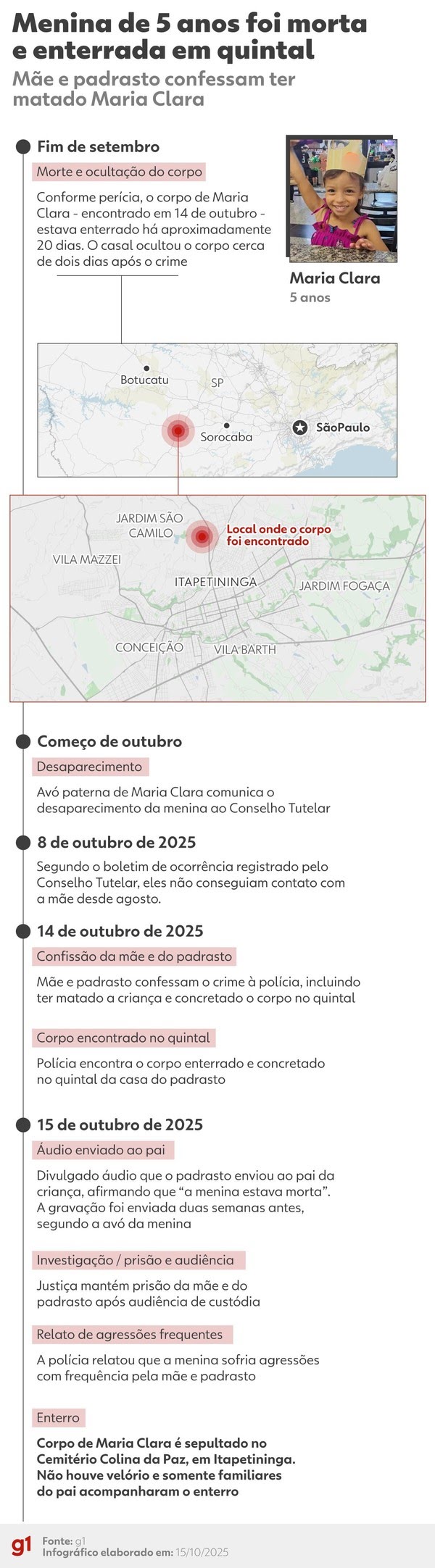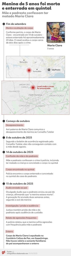 De acordo com a perícia, o corpo de Maria Clara, encontrado em 14 de outubro, estava enterrado havia cerca de 20 dias, ou seja, no fim de setembro. A investigação aponta que o casal ocultou o corpo dois dias após o crime.