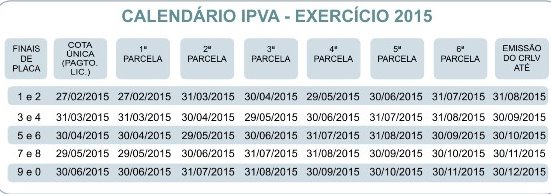 Os proprietários de veículos no Estado de Alagoas pagarão, em média, 4,1% menos no Imposto sobre a Propriedade de Veículos Automotores (IPVA) 2015, em relação ao exercício de 2014. O cronograma de pagamento do imposto inicia-se em 27 de fevereiro estendendo-se até 30 de novembro de 2015. Quem fizer a opção de pagamento em cota única, o prazo termina em 30 de junho.