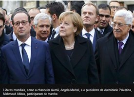 Já em Paris, cerca de 40 líderes mundiais deram os braços e caminharam junto à multidão, entre eles o presidente da França, François Hollande, o premiê britânico, David Cameron, a chanceler alemã, Angela Merkel, o premiê italiano, Matteo Renzi, o premiê espanhol, Mariano Rajoy, o presidente do Mali, Ibrahim Boubacar Keita, e até os inimigos de longa data Binyamin Netanyahu, premiê israelense, e Mahmoud Abbas, presidente da Autoridade Palestina.