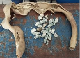 Os agentes perceberam que a mulher estava muito nervosa, pois, ao deixar a sacola com os policiais saiu com muita pressa. Ao verificar o conteúdo deixado pela suspeita foi constatado que havia maconha nas vísceras do animal.