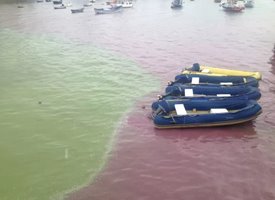 catsUma grande mancha com duas colorações, vermelha e esverdeada, surpreendeu os moradores e turistas na Praia da Armação em Búzios, na Região dos Lagos do Rio. Ela apareceu no início da manhã desta terca-feira (5) após a forte chuva que atingiu a região e também foi vista em outras duas praias. O Inea coletou amostras da água para tentar identificar que tipo de material está ocasionando o problema, já que, tanto a Prefeitura quanto a empresa responsável pelo tratamento de esgoto na cidade, a Prolagos, descartaram a possibilidade de despejo de esgoto, diante das características e odor apresentados pela mancha.
