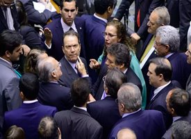 A confusão começou em uma discussão entre o deputado Roberto Freire (PPS-SP) e Orlando Silva (PCdoB-SP), que divergiam sobre uma manifestação da Força Sindical, que jogou cédulas falsas de dólares no plenário, enquanto a Câmara discutia a MP 665, que muda regras do seguro-desemprego.