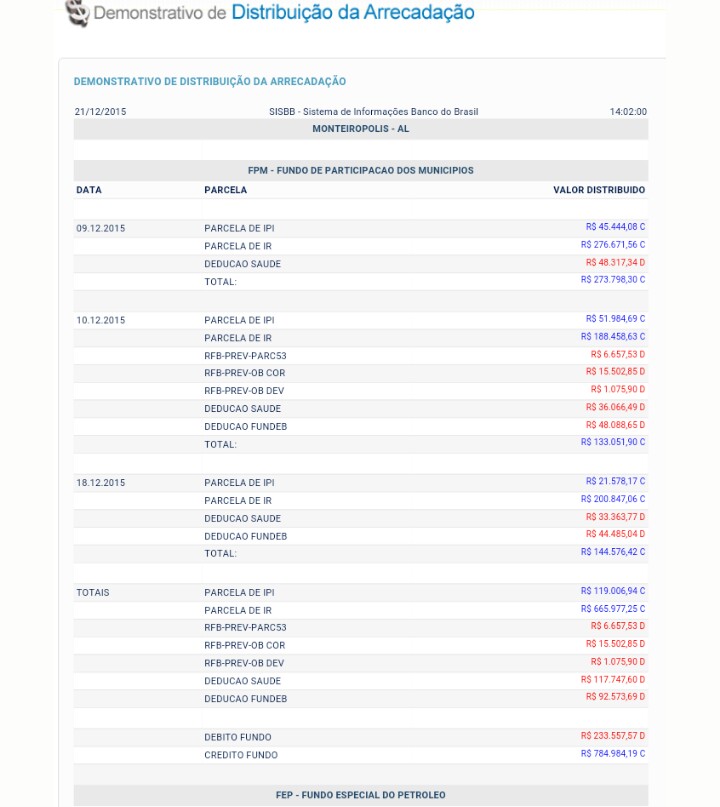 Monteirópolis recebeu um valor total do FPM de R$ 784. 984,19, segundo indica abaixo o Demonstrativo de Distribuição da Arrecadação. Na área da Saúde o município recebeu R$ 117.747,60, valor destinado ao Fundo Nacional da Saúde (FUS).