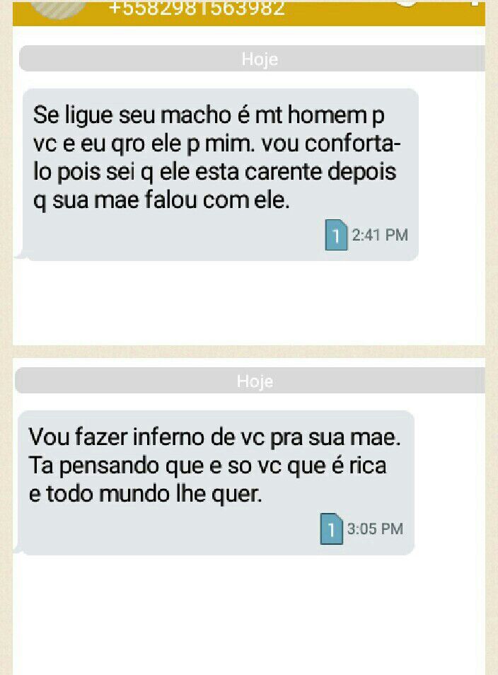Uma das vítimas decidiu enviar a nossa reportagem um Print de algumas das mensagens ofensivas que segunda ela nos contou não sabe de quem se trata, pois não conhece a suposta mulher, e o conteúdo das mensagens se caracterizam como inverdades e denigrem a sua imagem.