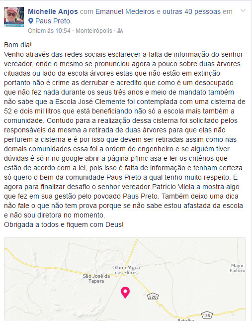A Diretora Afastada da Escola Municipal José Clemente, no povoado Paus Preto, município de Monteirópolis, Sr (a). Michelle Anjos, esclarece por meio de redes sociais sobre sua decisão de retirar uma Árvore no povoado que foi frustrada por moradores e inclusive um vereador.