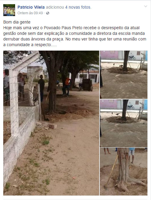 Em seu perfil no Facebook, o vereador classificou como um desrespeito por parte da Diretora em retirar a árvore sem ao menos realizar uma reunião na comunidade.