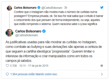 De acordo com o filho do presidente, o aplicativo quer “limitar o interesse da informação e criar manipulados como em todos os campos”. Isso porque o Instagram anunciou que começará a testar, a partir desta quarta-feira, um sistema para ocultar as curtidas de usuários no Brasil.