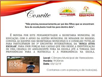 A intenção é apoiar os governos na identificação, registro, controle e acompanhamento de crianças e adolescentes que estão fora da escola ou em risco de evasão. Por meio da Busca Ativa Escolar, Minador do Negrão terá dados concretos que possibilitarão planejar, desenvolver e implementar políticas públicas que contribuam para a inclusão escolar. Na oportunidade, profissionais representantes de diversas áreas receberão capacitação para identificação de uma criança ou adolescente fora da escola até a tomada das providências necessárias para a matrícula e a permanência do aluno na escola.