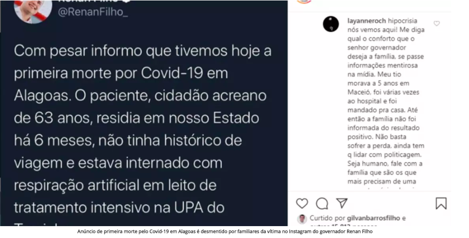 “Lá o médico diagnosticou pneumonia, receitou o medicamento, mas depois de cinco dias deu uma piora e infelizmente meu sogro veio a óbito! Lutamos por uma vaga na UTI sem sucesso. Quero dizer que o senhor governador está em busca de mídia. Cuidado, viu, senhor governador! Pra isso podemos entrar com uma ação contra o senhor, sua equipe anda mal informada. Acabamos de ir na UPA novamente e ele alegou que não chegou o resultado, disse que não sabe o que deu no senhor, governador”, disse Mikayla Souza, em um comentário que foi censurado da publicação de Renan Filho.